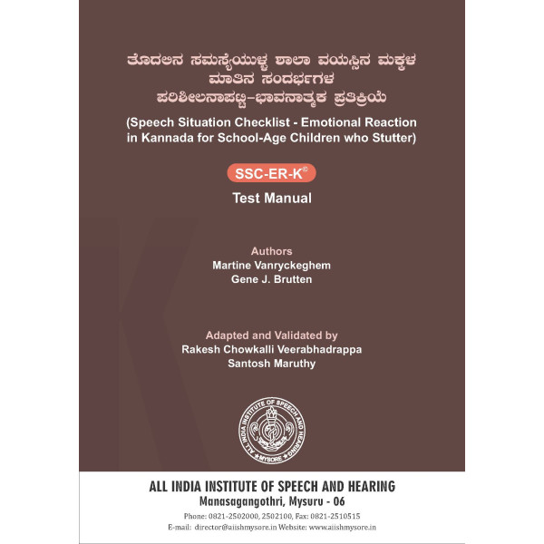 This is a standardized assessment tool developed to evaluate emotional reactions associated with speech situations in Kannada-speaking school-age children who stutter. Adapted and validated for the Indian context, it forms a component of the Behavior Assessment Battery (BAB). The manual details test administration, scoring, reliability, validity, and normative data. SSC-ER-K aids clinicians in differential diagnosis and in planning individualized intervention by identifying speech-related emotional and affective responses.